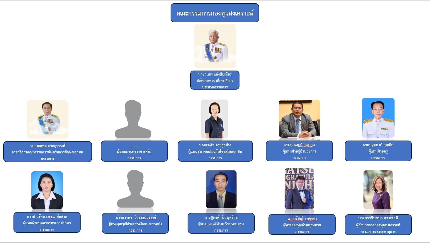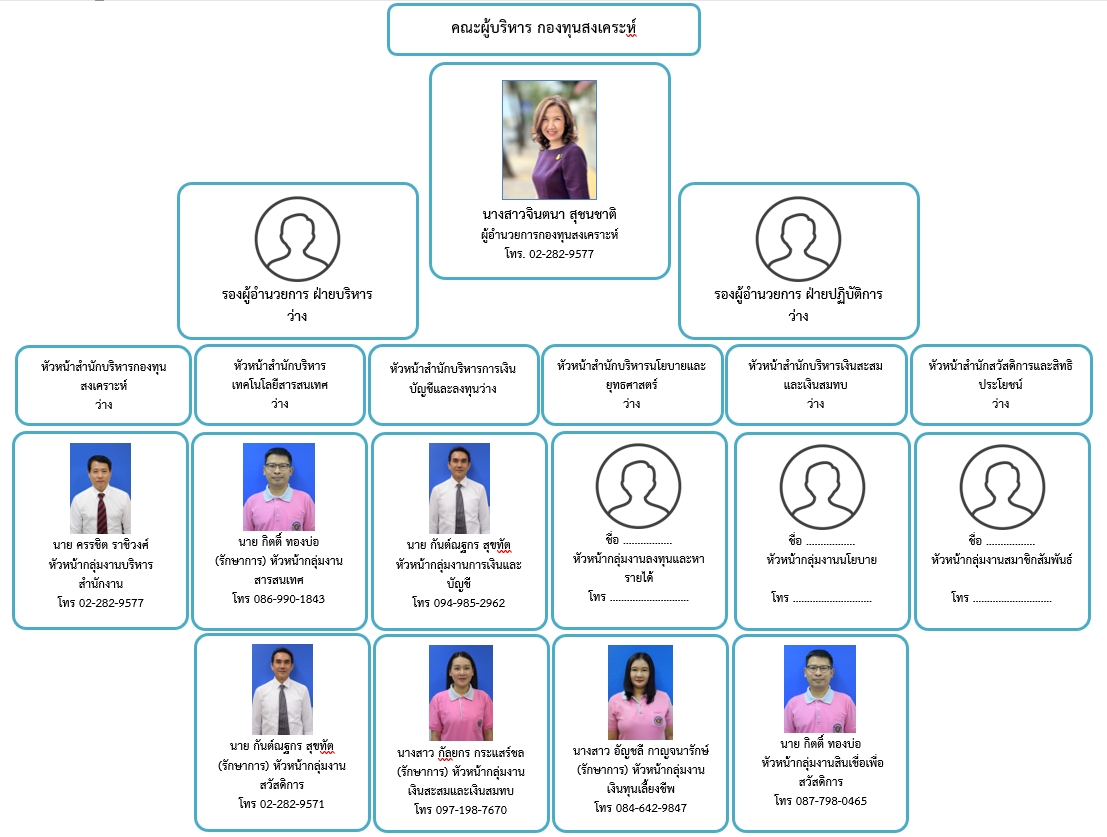 กองทุนสงเคราะห์ ความเป็นมา วิสัยทัศน์ ค่านิยม พันธกิจ แผนยุทธศาสตร์ แผนปฏิบัติการ ผลการดำเนินงาน นโยบายกำกับดูแลองค์การที่ดี การดำเนินงานตามนโยบายรัฐบาล ผังโครงสร้างองค์กร คณะกรรมการ